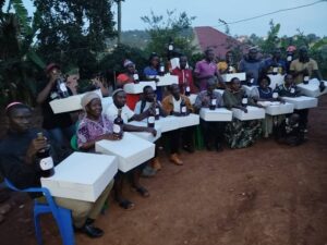 before us, neatly packed in elegant white boxes piled on a table. Shortly before that, the produced wine previously stored in a big drum was carefully bottled and labeled “Shalom Wines Uganda.” Then it was time to distribute the matzot to all the Jewish communities participating in the event. From Kwania to Beth Shalom in Kampala to Luwero and Namutumba, and from the Namanyonyi Jewish community to Kawempe, two boxes of matzah and bottles of wine were given. Others include the Nasenyi and Buseta Jewish community, Nangolo, Putti, and Beit Shalom Nabweru. No doubt, with matzah and wine in hand, the seder night would come alive in various synagogues and community halls.